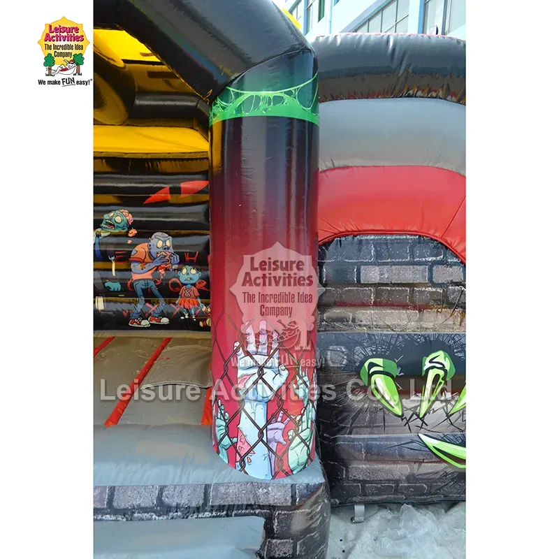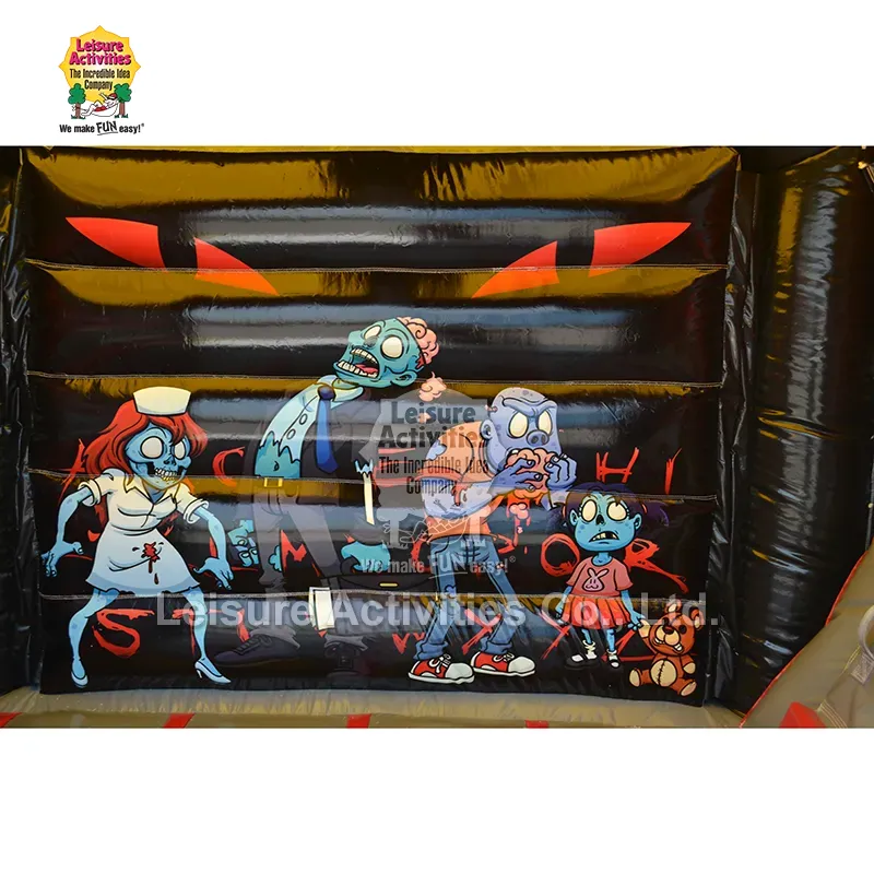 சிறிய ஊதப்பட்ட மல்டிபிளே துள்ளல் கோட்டைகள் ஸ்லைடுடன் பேய்: இந்த ஜாம்பிதீம் "பேய் காம்போ" ஊதப்பட்ட அதன் பரபரப்பான கார்ட்டூன்-திகில் அழகுடன் குழந்தைகளை கவரும் வகையில் வடிவமைக்கப்பட்டுள்ளது. தடிமனான சிவப்பு, பளபளப்பான கருப்பு, மற்றும் வினோதமான பச்சை மற்றும் ப்ளூஸ் ஆகியவற்றின் தைரியமான கலவையானது ஒரு தெளிவான, அற்புதமான சூழலை உருவாக்குகிறது. கார்ட்டூன் ஜாம்பிகளின் பெரிய, விளையாட்டுத்தனமான கிராபிக்ஸ் டைனமிக் போஸ்களில்—செவிலியர், மூளையை உண்ணும் கதாபாத்திரம் மற்றும் டெட்டி பியர் உடன் ஜாம்பி குழந்தை போன்ற- பயமுறுத்துவதை விட வேடிக்கையாக உள்ளது. பெரிய நீல நிற ஜாம்பி கூரையில் ஊர்ந்து செல்வது, நகங்கள் கொண்ட கைகள் சுவர்களில் வெடிப்பது மற்றும் நெடுவரிசைகளில் உள்ள சங்கிலிகள்/கிராபிக்ஸ் போன்ற ஊடாடும் கூறுகள் கற்பனையான விளையாட்டைத் தூண்டுகின்றன. ஒரு பாதுகாப்பு மேல் உறையுடன் கூடிய மூடப்பட்ட அமைப்பு நிழல் மற்றும் லேசான மழை பாதுகாப்பை வழங்குகிறது, அதே நேரத்தில் மூடப்பட்ட ஸ்லைடு சாகசத்தை சேர்க்கிறது. 10 அடி உயரமானது, உட்புற மற்றும் வெளிப்புற பயன்பாட்டிற்கு, ஹாலோவீன் விருந்துகள், இலையுதிர் விழாக்கள், கருப்பொருள் கொண்ட பிறந்தநாள் நிகழ்வுகள் மற்றும் பயமுறுத்தும் கொல்லைப்புற வேடிக்கை ஆகியவற்றைக் கச்சிதமாகப் பொருத்துகிறது.